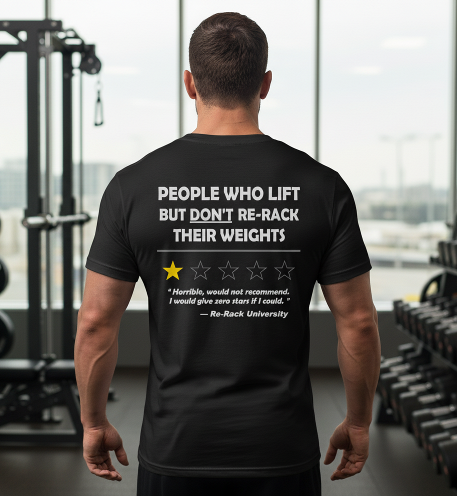 The One Star Tee calls out every gym-goer who lifts but leaves their weights behind. Bold, sarcastic, and 100% true—because at Re-Rack University, we believe good gym etiquette deserves five stars, not one.